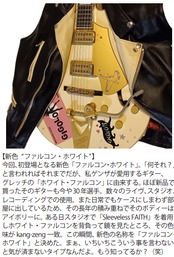 今回、初登場となる新色「ファルコン・ホワイト」。「何それ?」と言われればそれまでだが、私ゲンザが愛用するギター、グレッチの「ホワイト・ファルコン」に由来する。ほぼ新品で買ったそのギターも今や30年選手。数々のライヴ、スタジオ、レコーディングでの使用。また日常でもケースにしまわず部屋に出しているため、その長年の積み重ねでそのボディーはアイボリーに。ある日スタジオで「Sleeveless FAITH」を着用しホワイト・ファルコンを背負って鏡を見たところ、その色味がkang-zeng一致。この瞬間、新色の名称を「ファルコン・ホワイト」と決めた。まぁ、いちいちこういう事を言いたいだけなのは、そろそろ皆さんもお気付きだろう。