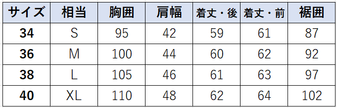 34:胸囲95 肩幅42 着丈・後59 着丈・前61 裾囲87